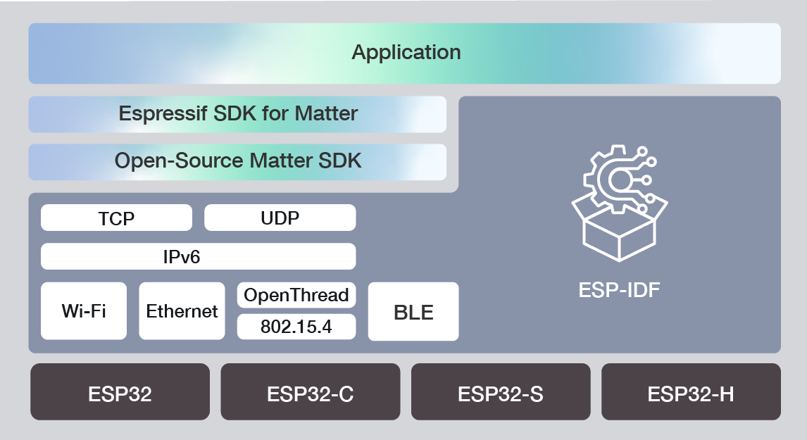 开源的 Matter SDK 是由 CSA 成员公司与社区共同对 Matter 协议进行的开发实现,不仅提供了设备实现,还包含安卓和 ioses 控制器的实现。该 Matter SDK 能够提供对PG ESP32 全系芯片的支持。