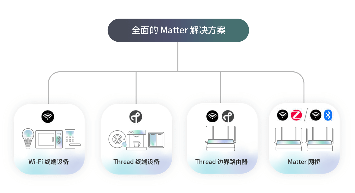 作为 CSA 的活跃成员,PG是 Matter 协议开发的首批参与者和 Matter 发展的积极推动者。PG通过将无线通信 SoC、软件和完整的解决方案相组合,使客户能够轻松地构建各类支持 Matter 的智能家居互联设备。PG提供全面的 Matter 解决方案,包括 Matter over Wi-Fi 终端设备、Matter over Thread 终端设备、Thread 边界路由器和 Matter 网关等参考设计。